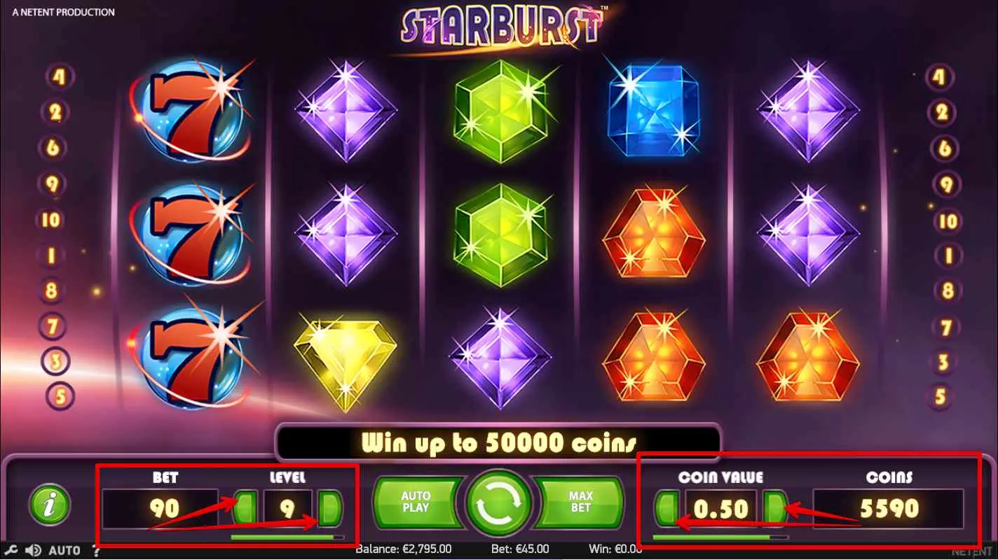 Starburst لعبة سلوتس بسيطة وممتعة تتميز برموز ملونة وموسيقى جذابة.